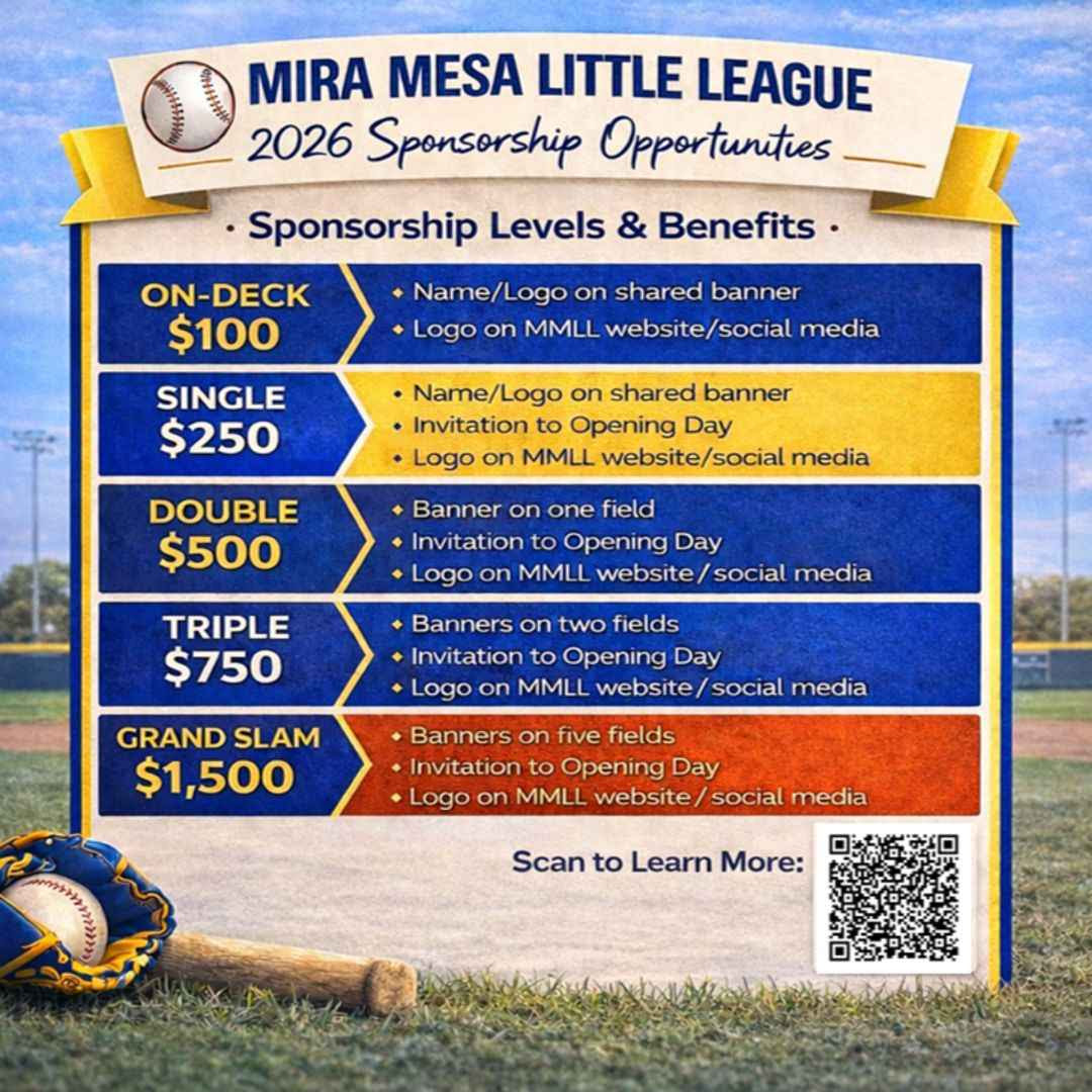 If you own a business, work for a company interested in community involvement, or know someone who may be interested in sponsoring our league, we would love to connect. For questions, please reach out to our Sponsorship Coordinator, Rob Roth, at sponsorships@miramesalittleleague.org.
